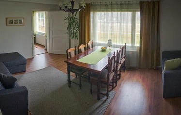 Das in Grüntönen gehaltene Biologie-Geografie-Apartment bietet mit seinen zwei Zimmern bequemen Platz für bis zu sechs Personen. Vom Fenster aus blicken Sie auf den Garten und zum Sportplatz der alten Schule, der unsere Gäste und vor allem Familien mit Kindern zu Sport und Spiel einlädt. Auf Höhe des einzigartig an einer Wasserscheide gelegenen Salpalinjan Hovi teilen sich die Wassersysteme der Flüsse Vuoksi und Kymijoki.